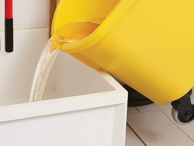 A molded-in pour spout and sink ledge help direct water while emptying the mop bucket.